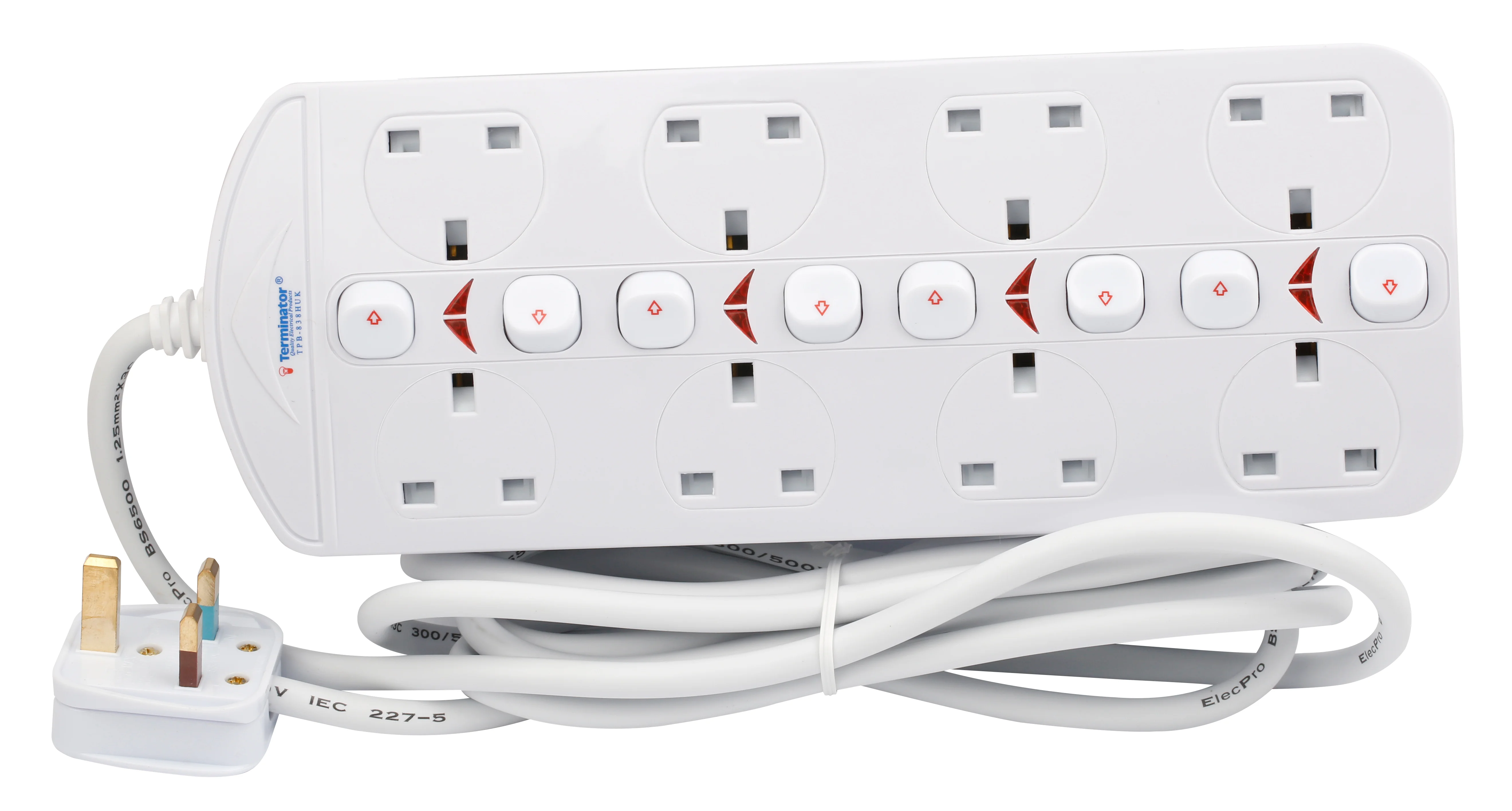 TERMINATOR 8 Way Double Side UK Power Extension Socket With Individual Switches 3M 1.25mm2 Cable 13A Plug