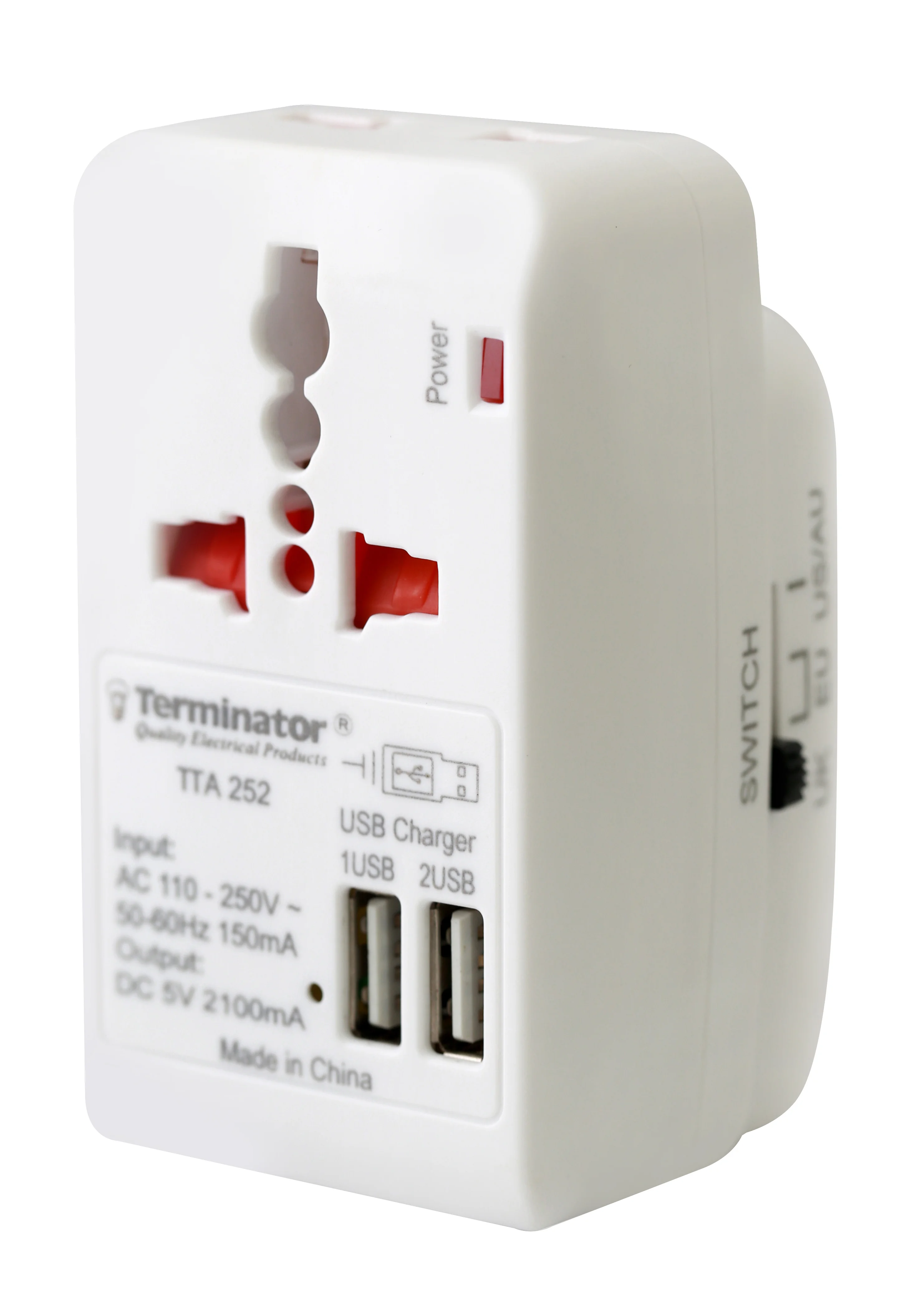 TERMINATOR Multi pin Travel Adaptor with Universal & 2RP Socket+2 USB 2.1A