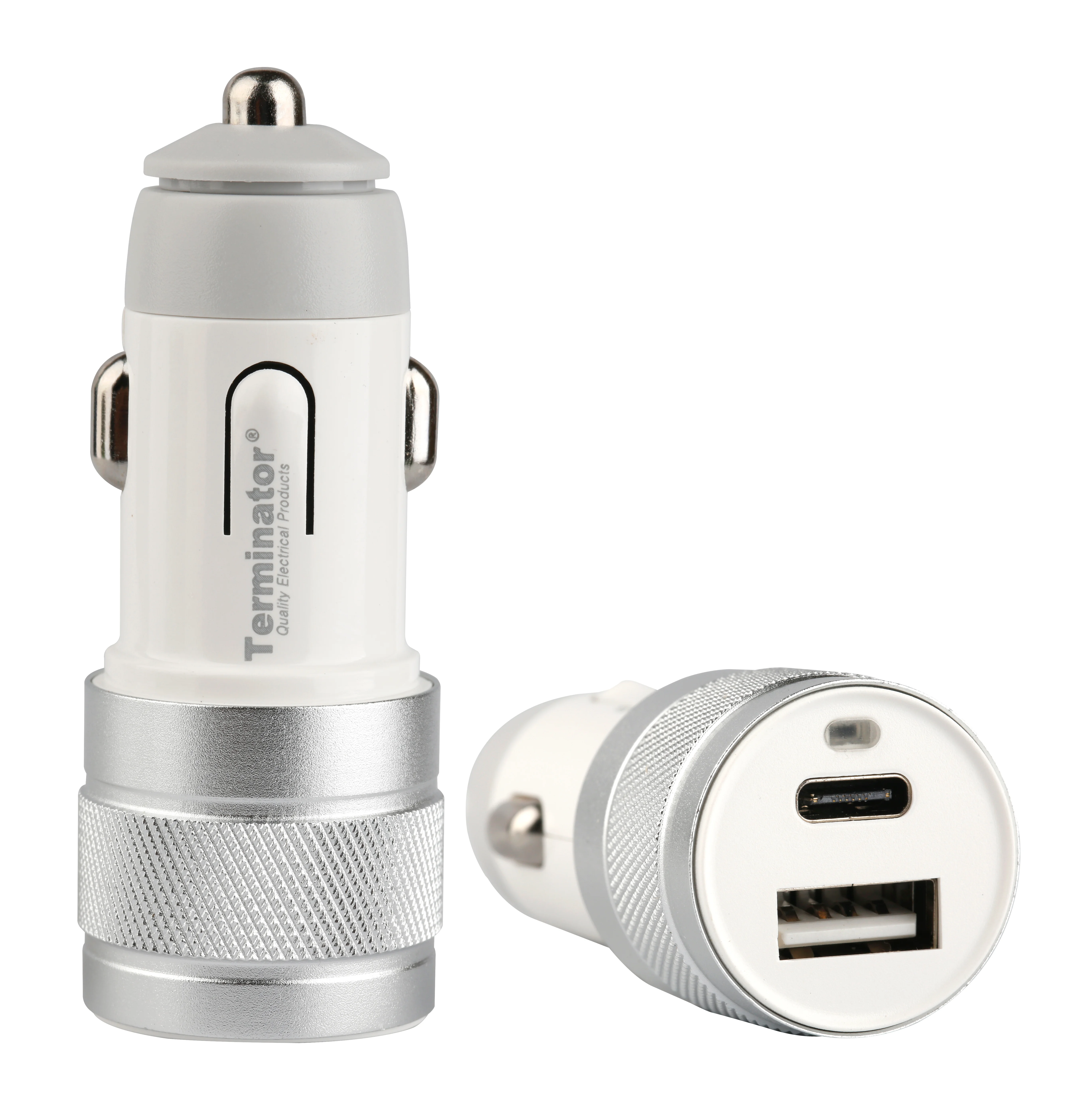 TERMINATOR USB Car Charger with 30W Fast Charging USB-A (QC3) & USB-C (PD) with Blue Light Indicator-White