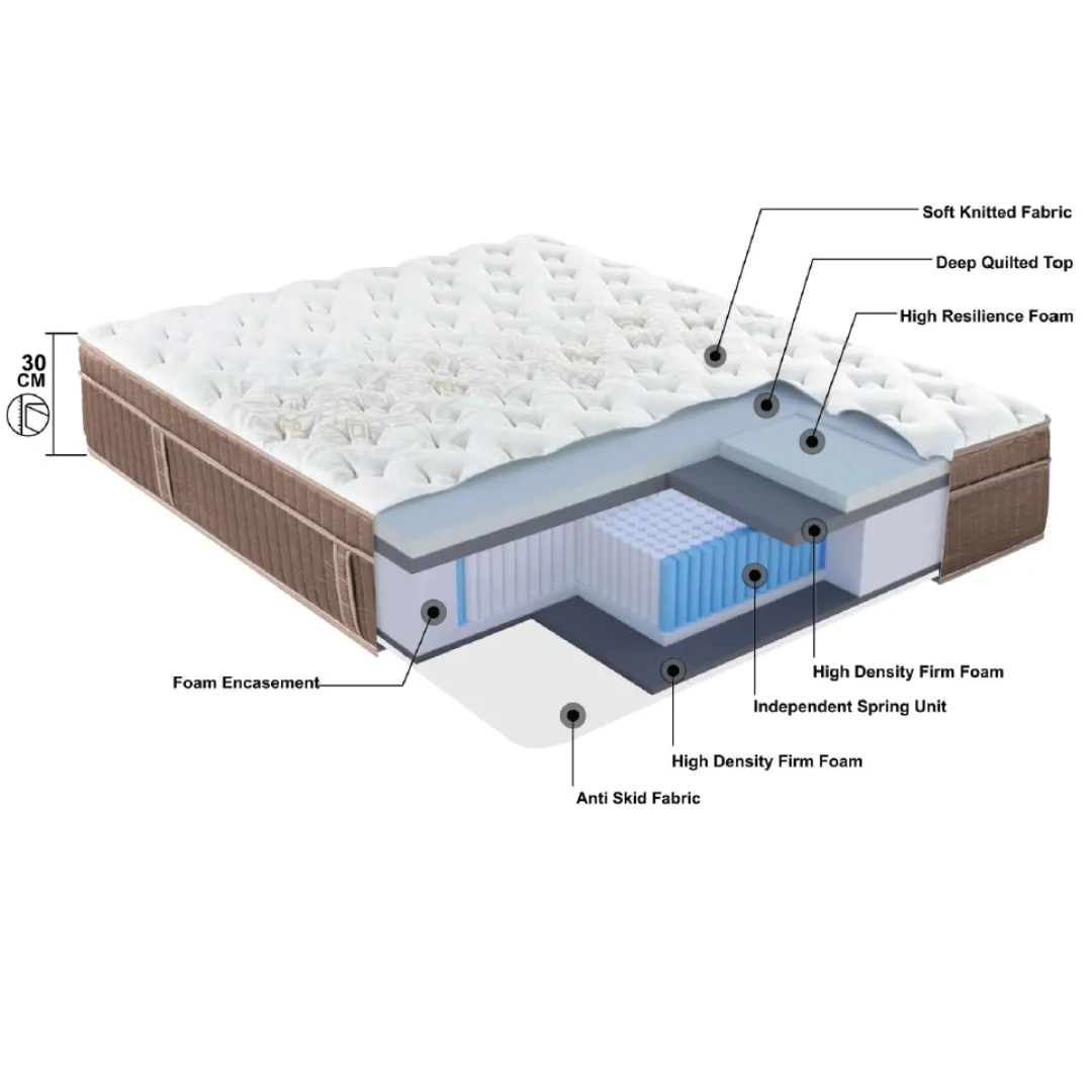 This mattress is very buoyant and resilient, giving it high responsiveness. Fast to return to shape when pressure is applied and released, making it good for any application. This is deal for those who enjoy their movement on bed. With an open-cell structure. High Resilience foam is very springy butstill offes bouncy support. This trait leads it’s firmness to the medium level. Additional Information Quilting Type - Deep Quilting Fabric Type - Soft Knitted Fabric Core Type - Independent Spring Unit (Pocket Spring) Comfort Layer - HD Soft Foam Foam Encasement - Yes Cover Type - Euro Top Mattress Height - 30cm SOFT KNITTED FABRIC DEEP QUILTED TOP HIGH RESILIENCE FOAM HIGH DENSITY FOAM (FIRM)