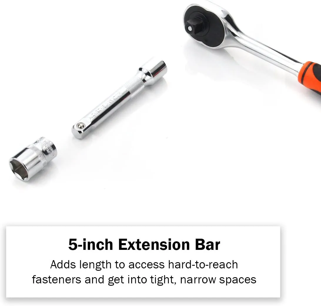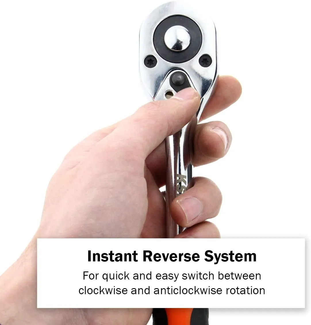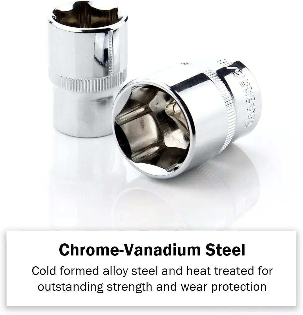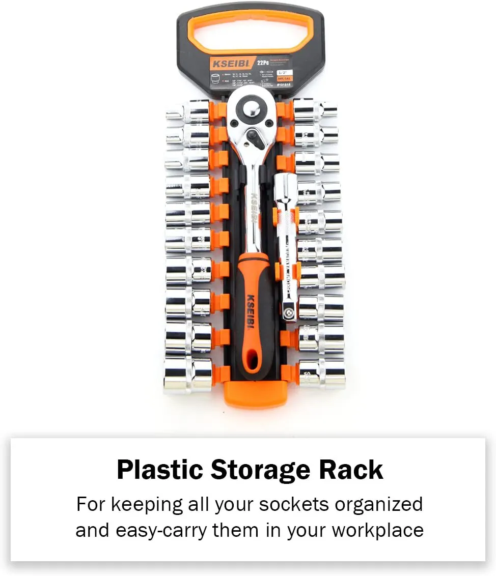 The KSEIBI Hexagon Socket And Ratchet Set 1/2" 22-Pc is a dependable solution for tackling a wide range of automotive repair tasks. Designed to provide both precision and durability, this 22-piece set features chrome vanadium steel sockets with a protective chrome-plated finish, ensuring strength and resistance to wear over time. The set is equipped with a ratchet that delivers smooth, efficient operation, making it a practical choice for tightening or loosening fasteners in demanding environments. Organized in a compact plastic storage rack, it?? easy to keep your tools secure and accessible, whether in a workshop or on the go. Engineered for mechanics, technicians, and automotive professionals, this KSEIBI set offers reliable performance for both routine maintenance and more complex repair work. With its robust construction and thoughtful design, it?? a toolset built to meet the demands of daily use. 1. Includes 22 versatile pieces designed for precision and efficiency in automotive repairs. 2. Made from durable chrome vanadium steel for long-lasting performance. 3. Chrome-plated finish resists corrosion and enhances tool longevity. 4. Hexagon socket design ensures a secure grip and reduces slippage. 5. 1/2" drive size accommodates a wide range of applications. 6. Ergonomic ratchet handle allows smooth and effortless operation. 7. Comprehensive set suitable for both professionals and DIY enthusiasts. 8. Precision-engineered for optimal torque and reliable fastening. 9. Compatible with various fastener types for added versatility. 10. Packaged in a plastic storage rack for organized tool management.