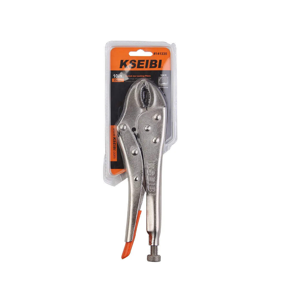 The KSEIBI Curved Jaw Locking Plier with Wire Cutter is a dependable, dual-purpose tool engineered for secure gripping and clean wire cutting. Measuring 10 inches, its curved jaw design excels in holding irregular shapes, pipes, or flat surfaces with a firm, non-slip grip, making it versatile for a variety of applications. Constructed from durable tool steel with a nickel-plated finish, this plier resists rust and wear, ensuring long-lasting performance even in demanding work environments. The integrated wire cutter enhances functionality, allowing users to tackle gripping and cutting tasks without switching tools, increasing efficiency on the job. Whether used in automotive repair, metalworking, or general maintenance, this tool is designed to meet the needs of professionals who demand precision and reliability. Like all KSEIBI tools, it reflects the brand?? commitment to durability and performance, making it a valuable addition to any toolbox. Packaged in a double blister card for safe storage and retail display, the KSEIBI Curved Jaw Locking Plier is ready to deliver consistent results in tough working conditions. 1. 10" curved jaw locking plier designed for secure gripping and wire cutting. 2. Made from high-quality tool steel for enhanced durability and performance. 3. Nickel-plated finish provides resistance to corrosion and wear. 4. Curved jaw design allows for firm grip on various shapes and surfaces. 5. Integrated wire cutter adds versatility for cutting tasks. 6. Strong locking mechanism ensures stability and precision during use. 7. Suitable for both general consumers and professional industry applications. 8. Ergonomic design enhances comfort and reduces hand fatigue during extended use. 9. Reliable tool for gripping, clamping, and cutting in various tasks. 10. Packaged in a double blister card to maintain product integrity.