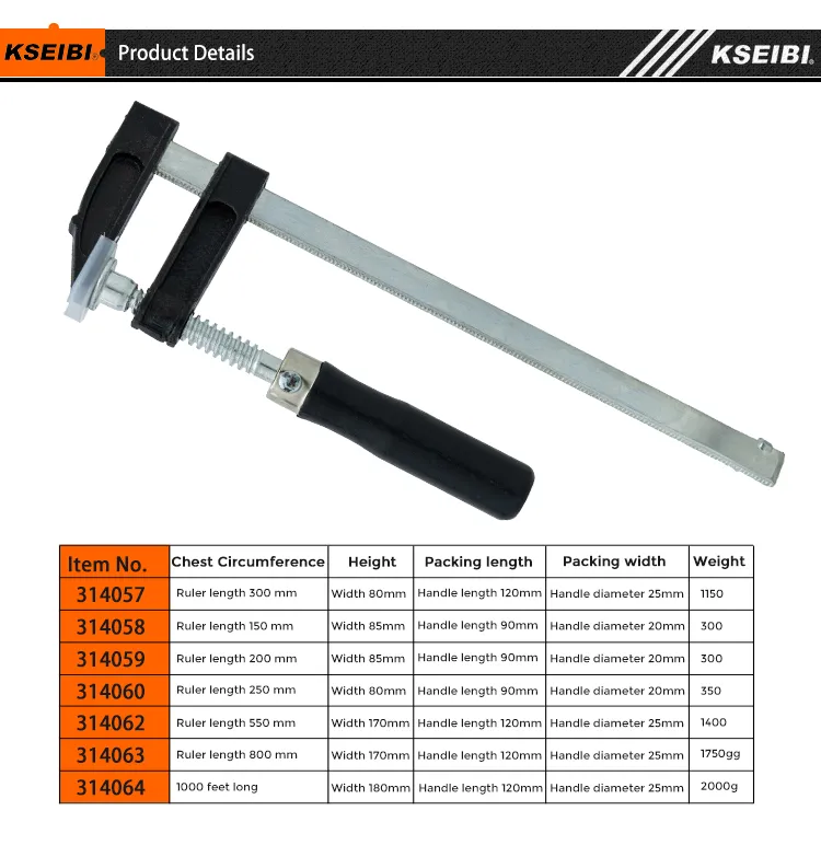 The KSEIBI Industrial F-Clamp is engineered to deliver reliable, heavy-duty clamping performance in demanding industrial and professional environments. Constructed from high-carbon steel, this robust tool provides exceptional strength and durability, ensuring it holds up under intense pressure and repeated use. The nickel-plated thread bar enhances corrosion resistance, maintaining smooth operation and longevity even in challenging conditions. Its efficient design allows for secure, precise clamping, making it an essential tool for applications such as metalworking, woodworking, assembly, and fabrication. Packaged in bulk for convenience, this F-clamp is ideal for manufacturers, workshops, and contractors who require consistent performance from their tools. With KSEIBI?? reputation for precision and reliability, the Industrial F-Clamp is a trusted choice for tackling the toughest clamping tasks with confidence. 1. High-carbon steel construction ensures exceptional strength and durability for heavy-duty tasks. 2. Nickel-plated thread bar provides resistance to corrosion and long-lasting performance. 3. Ergonomic design delivers secure and efficient clamping with minimal effort. 4. Heavy-duty build suitable for industrial use and demanding applications. 5. Precision-engineered components ensure reliable and consistent clamping pressure. 6. Versatile design compatible with a wide range of clamping tasks and materials. 7. Smooth operation of the thread bar allows for quick adjustments and ease of use. 8. Resistant to wear and tear, making it ideal for extended professional use. 9. Packaged in bulk for convenience in industrial and professional settings. 10. Designed to meet the needs of both general consumers and industry professionals.