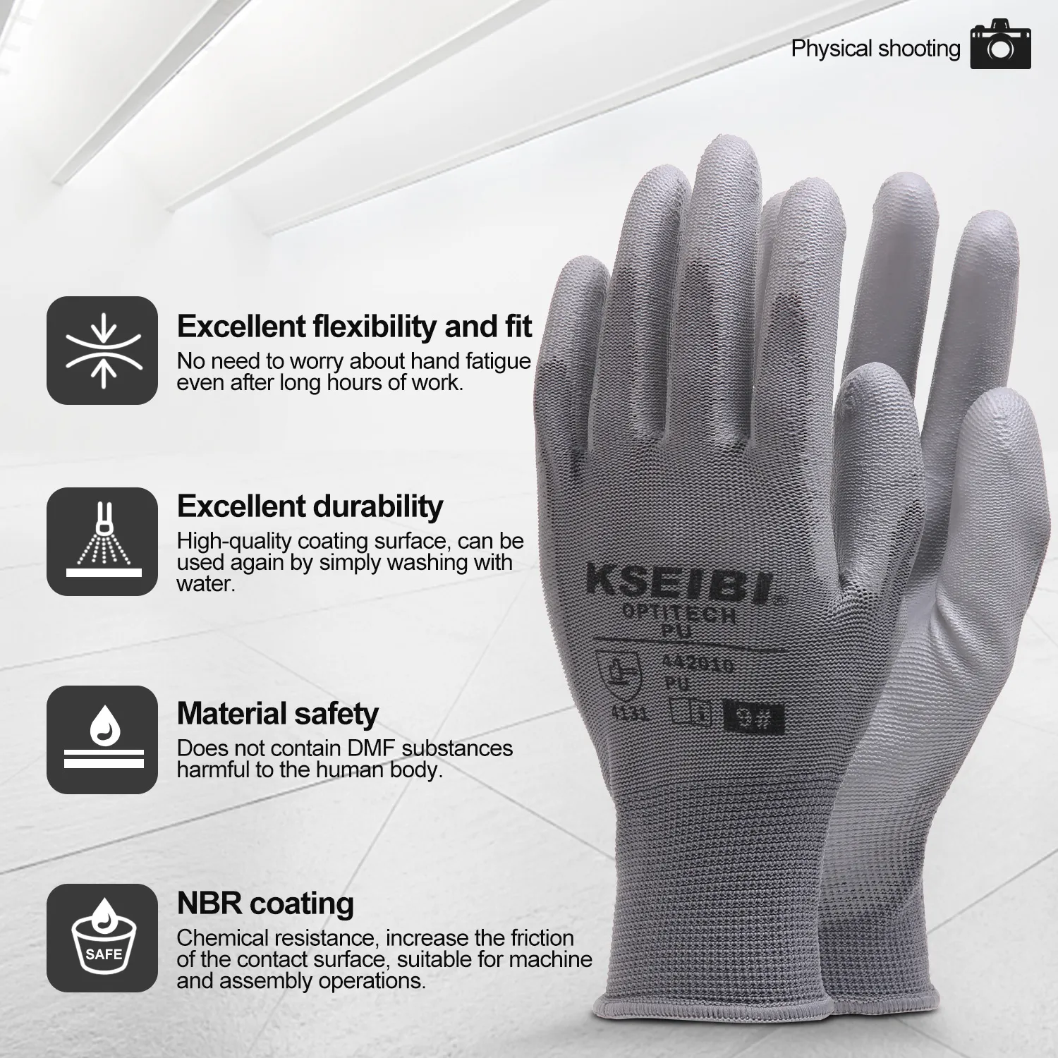 KSEIBI Pu Gloves are designed to provide reliable hand protection and comfort during light-duty tasks. Made from durable polyurethane, these gloves offer excellent dexterity and a snug fit, making them an ideal choice for precision work and general handling tasks where flexibility is key. Whether used in assembly, packaging, or light maintenance, these gloves enhance grip and reduce hand fatigue, ensuring efficiency and safety on the job. The lightweight construction minimizes bulk, allowing for natural hand movement without compromising on protection. Packaged on a convenient paper card, the KSEIBI Pu Gloves are a practical solution for professionals and industries requiring dependable handwear for everyday tasks. Built with the durability and reliability that KSEIBI is known for, they are a smart choice for workplaces that prioritize performance and comfort. 1. Polyurethane material ensures durability and flexibility for light work tasks. 2. Provides excellent tactile sensitivity for precision handling. 3. Lightweight construction enhances comfort during prolonged use. 4. Breathable design reduces sweating and improves user experience. 5. Snug fit minimizes hand fatigue and supports better grip. 6. Resistant to abrasions and minor cuts for added protection. 7. Ideal for general consumers and industry professionals alike. 8. Suitable for a variety of light-duty tasks and environments. 9. Packaged in a simple and recyclable paper card. 10. Designed for reliable performance and ease of use.