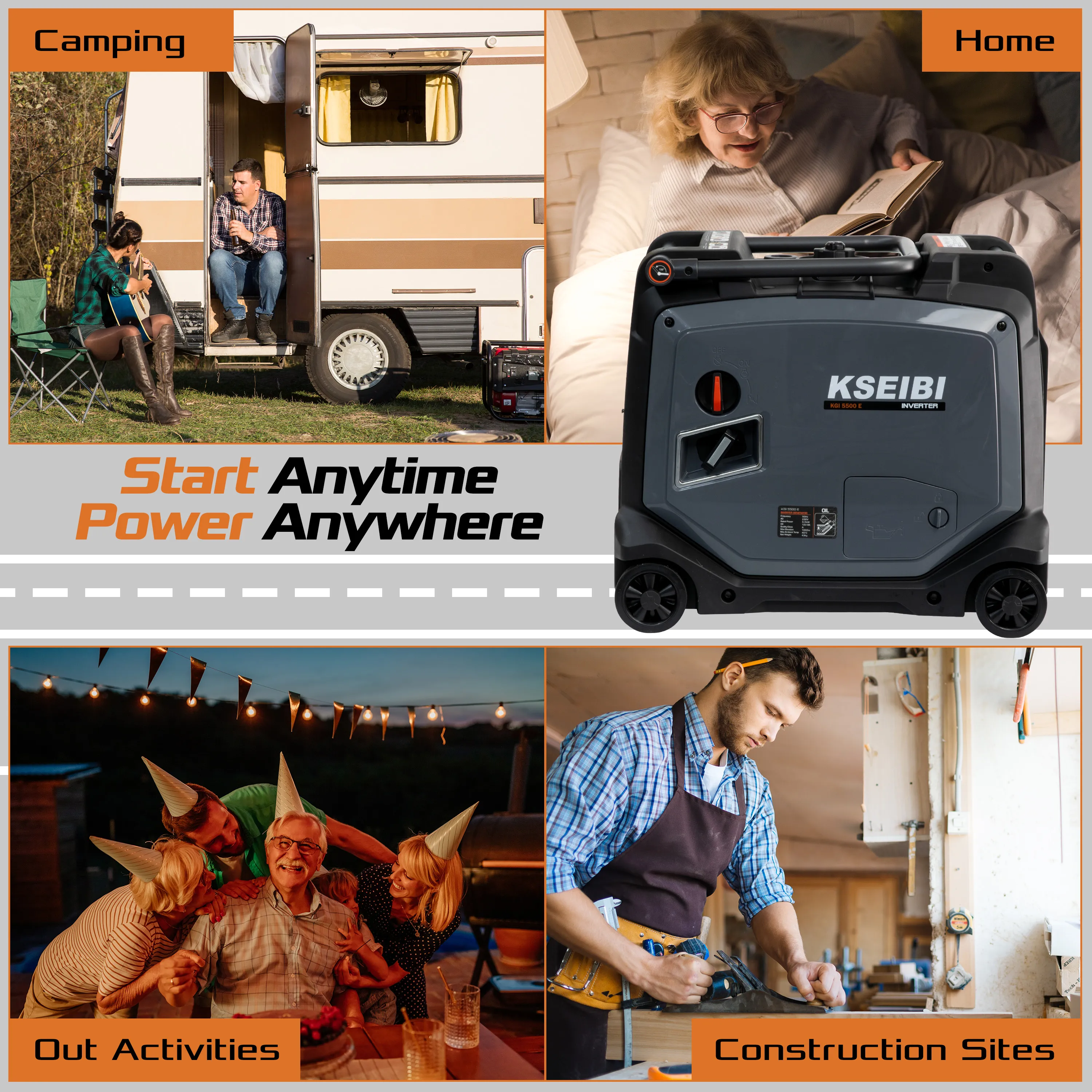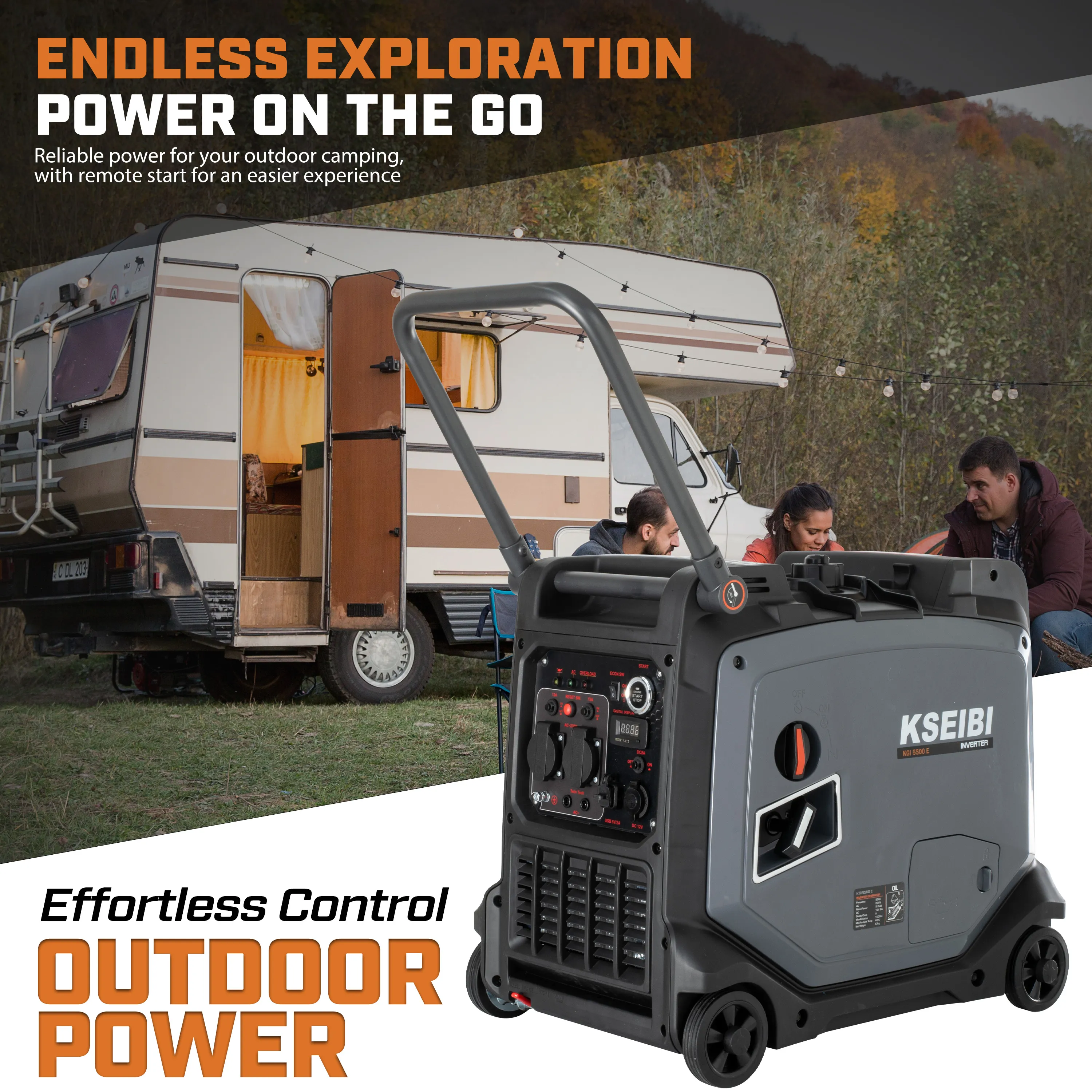 The KGI 5500 E Gasoline Inverter by KSEIBI is a dependable and portable power solution designed for outdoor enthusiasts, RV owners, and anyone preparing for emergencies. With its robust 79cc 4-stroke engine, this inverter delivers consistent and efficient performance, offering 5500 peak watts and 5000 running watts to handle essential appliances, tools, and electronics. Equipped with versatile power outputs??ncluding two 120V outlets, one 120V RV outlet, and a 12V DC outlet??he KGI 5500 E ensures compatibility with various devices, from small appliances to lighting systems. Its fuel-efficient design, featuring a 3.96-gallon tank, provides extended runtime while minimizing refueling needs, making it ideal for camping trips, tailgating, or power outages. Compact and lightweight, the KGI 5500 E is easy to transport and store, while its recoil start mechanism ensures hassle-free operation. Designed with KSEIBI's commitment to durability and reliability, this inverter is a practical choice for anyone seeking portable, on-demand power without compromise. 1. KGI 5500 E Gasoline Inverter delivers 5500 peak watts and 5000 running watts for reliable power. 2. Powered by a 79cc 4-stroke engine for consistent performance. 3. Equipped with two 120V outlets, one 120V RV outlet, and one 12V DC outlet for versatile usage. 4. Features a user-friendly recoil start mechanism for easy operation. 5. Designed with a 3.96-gallon fuel tank for enhanced fuel efficiency and longer runtime. 6. Compact and lightweight construction ensures easy transport and storage. 7. Suitable for powering small appliances, lights, and sensitive electronics. 8. An excellent choice for outdoor activities, camping trips, and emergency backup. 9. Built to provide stable and clean power for a variety of applications. 10. Engineered for durability and reliability in demanding environments.