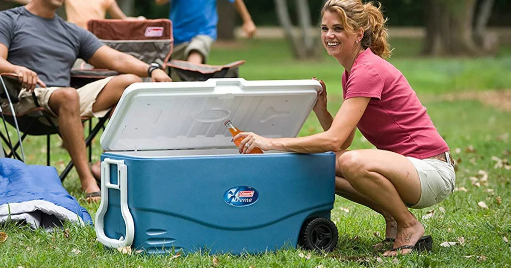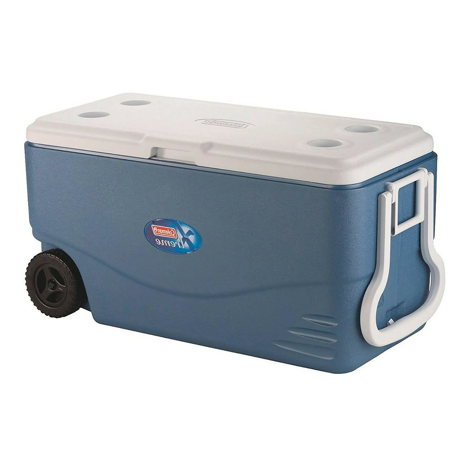 Keep your food and drinks cold for an extended time, and make the fun last longer, when you roll in with a Coleman" 100 Quart Xtreme" 5 Wheeled Cooler. Xtreme" technology uses an insulated lid and extra insulation in the walls to keep your items cold for up to 5 days. Large enough to hold 160 cans, you'll have plenty of space for refreshments for the entire party. Whether you're headed on a long weekend camping trip, a roadtrip, or across the ball field, the heavy-duty wheels and large tow handle let you roll over almost any terrain with hardly any effort. The additional 2-way handles make it easy to lift your cooler in and out of the car or onto a picnic bench. Once you arrive, the Have-A-Seat" lid will ensure you always have a place to sit and relax, and the cup holders molded into the lid will keep your cold drink close while you enjoy the day. When the fun is done, the leak-resistant channel drain makes it easy to empty any excess water without tilting the cooler, so you're ready for your next fun adventure.Keeps the Ice!" up to 5 days at temperatures up to 90 "F Xtreme" technology uses an insulated lid and extra insulation in the walls for longer ice retention Holds 160 cans Heavy-duty wheels for easy, reliable transport Leak-resistant channel drain for easy draining without tilting the cooler Have-A-Seat" Lid supports up to 113kg. for a place to sit and rest Large tow handle for easy pulling 2-way handles for easy lifting and carrying in a space-saving design Cup holders molded into the lid keep drinks close Low CO2 insulation for reduced carbon emissions from foam manufacturing Made in the USA