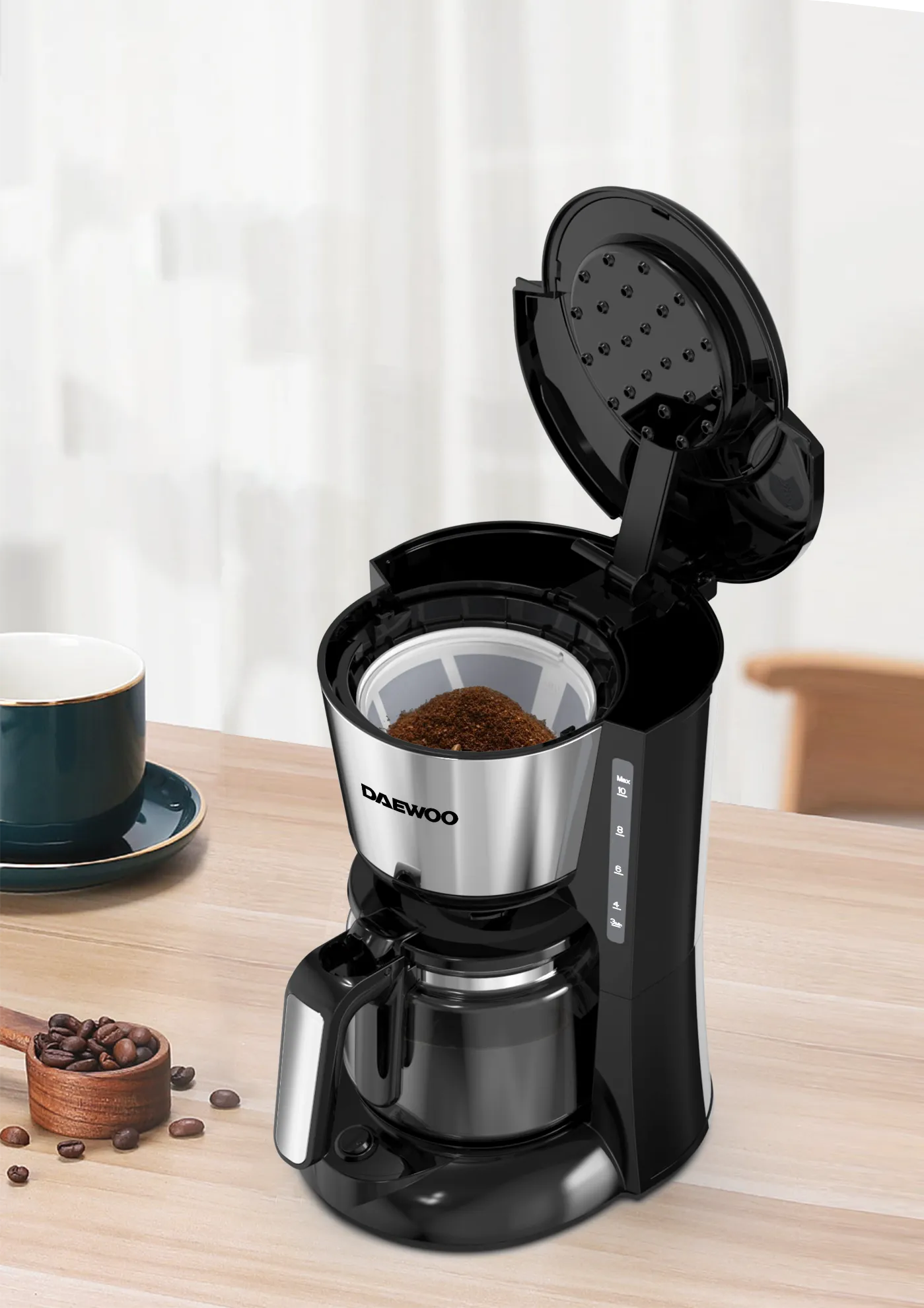 Barista " quality coffee: Bring quality barista-style coffee to your home with this powerful 1000W coffee maker. You"ll never have to venture to your local coffee shop for rich tasting beverages again. 25L capacity : Play host to friends and family with the large 1.25L capacity, providing an impressive 10 drinks all in one. Sturdy glass carafe: Includes a sturdy and stylish glass carafe to collect your coffee, complete with an ergonomic handle for comfortable and secure serving Keep warm function: Like to make a batch of coffee to last you the morning? No need to worry, the keep warm function with heated plate will keep your coffee at the perfect temperature just the way you like it Anti " Drip feature : Keeping your countertop free from mess and unwanted spillages, the anti-drip feature with removable funnel ensures your coffee maker keeps the kitchen looking clean and tidy Easy to clean: Enjoy a seamless and effortless experience from creating your coffee to cleaning the machine, simply rinse the mesh filter with water and place the jug into the dishwasher below 65" for a stress-free clean-up Permanent filter: The coffee maker includes a removable and reusable coffee filter. It has a holder so that you can conveniently take it for rinsing and cleaning after each use. The built-in coffee filtration saves money as there is no need for paper filters. Visible water gauge: Check water level without having to lift the lid and see how much is going in as you fill. The water indicator also ensures that you never overfill. Perfect coffee every time. Technical Specification Box Dimension (mm) - 280x230x357mm N.W. (Kg) - 1.83kg G.W. (Kg) - 2.50kg Brand - DAEWOO Colour - BLACK Power Wattage - 220-240V ~ 50-60Hz 800W Capacity - 1.25L