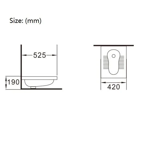 Type: Squatting pan WC; Material: Ceramic; Size:525x420x190mm; Gravity-fed flushing system