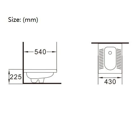 Type: Squatting pan WC; Material: Ceramic; Size:540x430x225mm; Gravity-fed flushing system