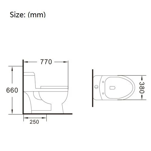 Type: Washdown one-piece toilet; Material: Ceramic; Size:770x380x660mm ; S-trap:250mm Roughing-in