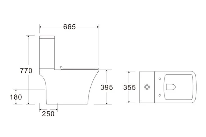 Type: Washdown two-piece toilet;Material: Ceramic; Size:665x355x770mm ; S-trap:250mm Roughing-in;