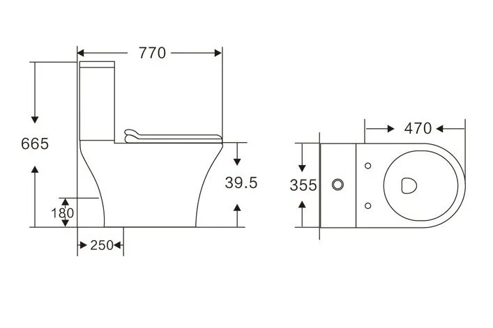 Type: Washdown two-piece toilet;Material: Ceramic; Size:665x355x770mm ; S-trap:250mm Roughing-in;