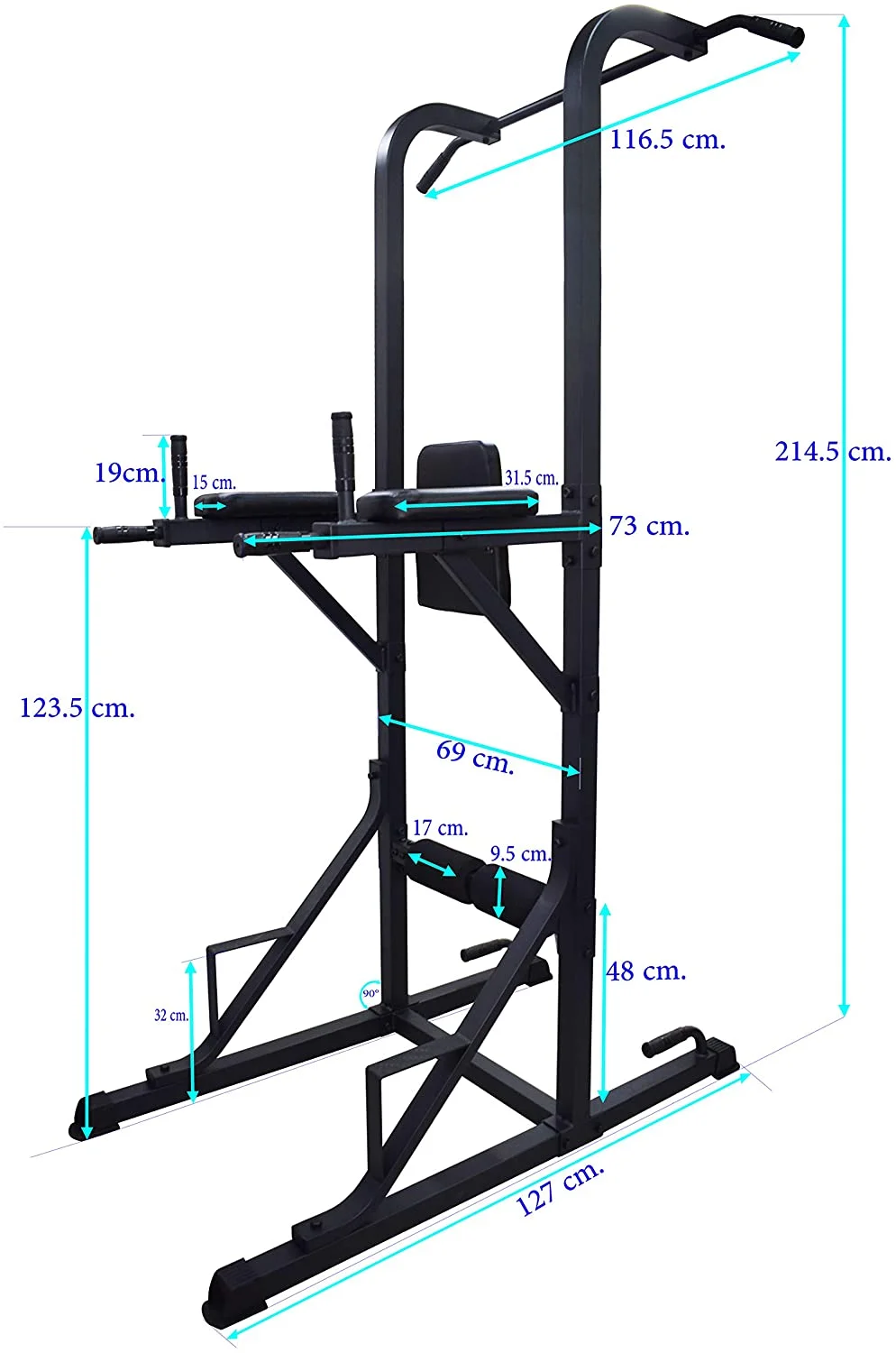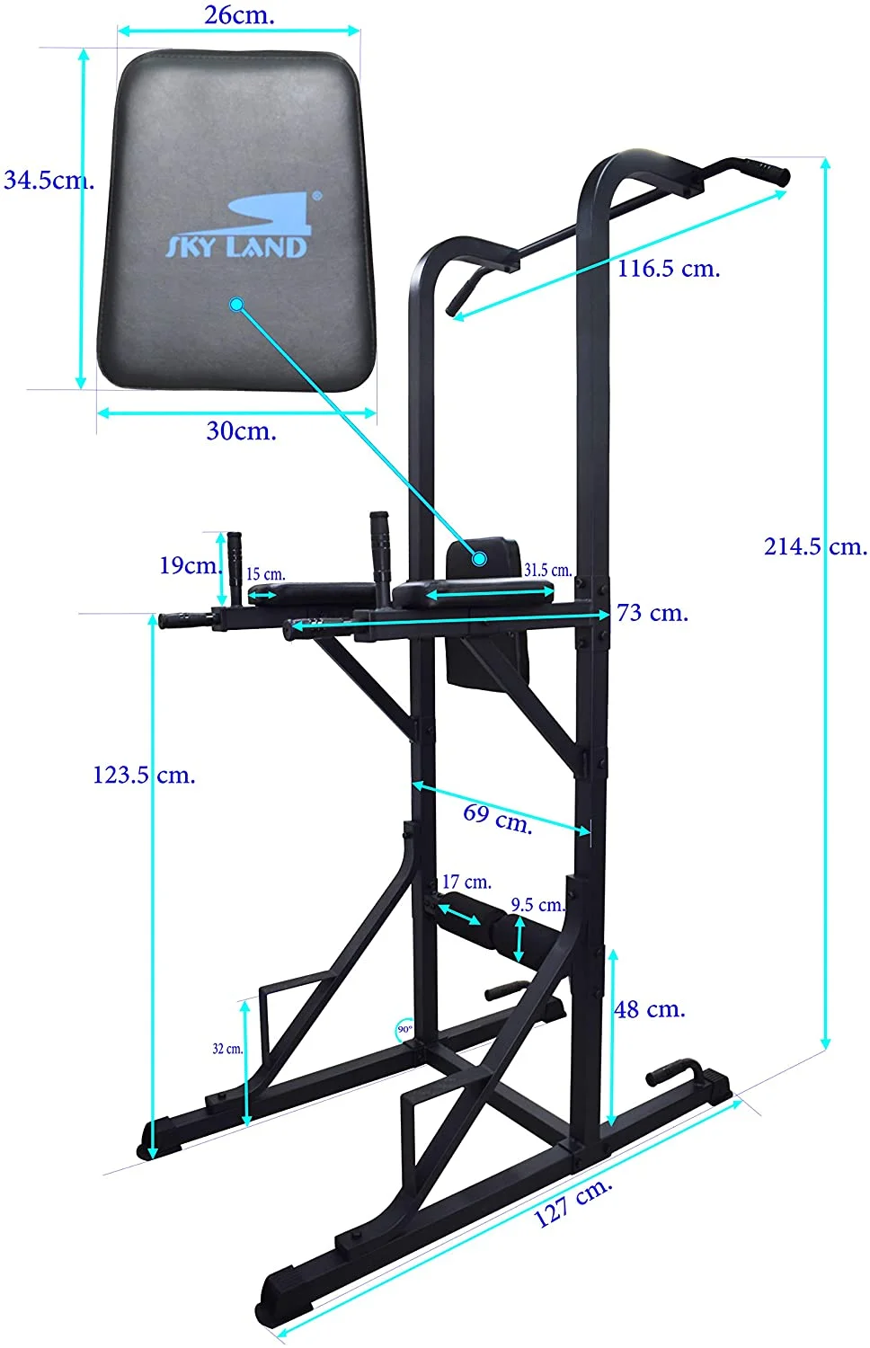 Effectively exercise your shoulders, arms, waist, buttocks, and legs Heavy-duty metal frame, main support frame, splayed anti eversion base, which ensures stability and durability Support many kinds of sports programs like a pull-up, dips, push-up, knee raise and so on Ten minutes a day, eliminating obesity, increasing muscle strength, relieving pain and shaping a perfect body ,Color Black Size L=127 x W=109 x H=213 cm Style EM-1852 Season Year-round Batteries Included? No Brand SKY LAND Department Unisex Adult Manufacturer SKY LAND Item model number EM-1852 Package Dimensions 135.5 x 57 x 13 cm; 37.5 Kilograms Assemble Size: L=127 X W = 109 X H= 213 cm, Shipping Size: L=135.5 X W = 57 X H= 13 cm, Net Weight :40 kgs, Gross Weight: 37.5 kgs, Weight capacity: 150 kgs. Skyland Multi-Function AB Tower Stand Work Station EM-1852 is made of heavy-duty steel tube frame ensures steady support for the dip station. H Shaped frame base with skid-resistant feet, safe and stable. EM-1852 can effectively exercise your shoulders, arms, waist, buttocks and legs. Eliminating obesity, increasing muscle strength, relieving pain and shaping a perfect body. Heavy duty construction and easy to assemble.
